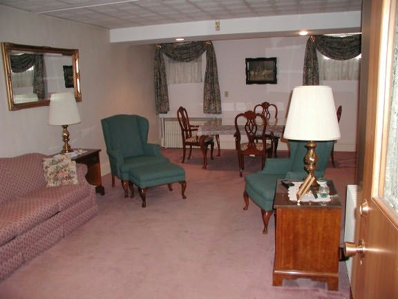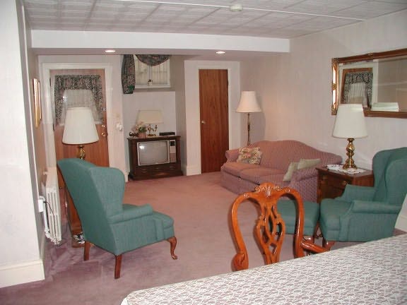 Queen Sized Four-Poster living room with hide-a-bed couch (Queen-Sized), dining area, private bathroom with sink and shower, dressing room, private entrance.Honeymoon Suite or Family Room.